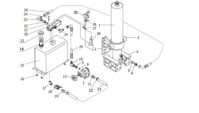 連接液壓系統_湖北佳恒科技有限公司 請按照上圖用油管和氣管将全部液壓元件連接進來。确保油管(軟管)長度足夠長,以免在舉升過程妨礙油缸的運動。組裝完成後沒有必要立即将氣體從油缸中排出,因為通過最初的幾">